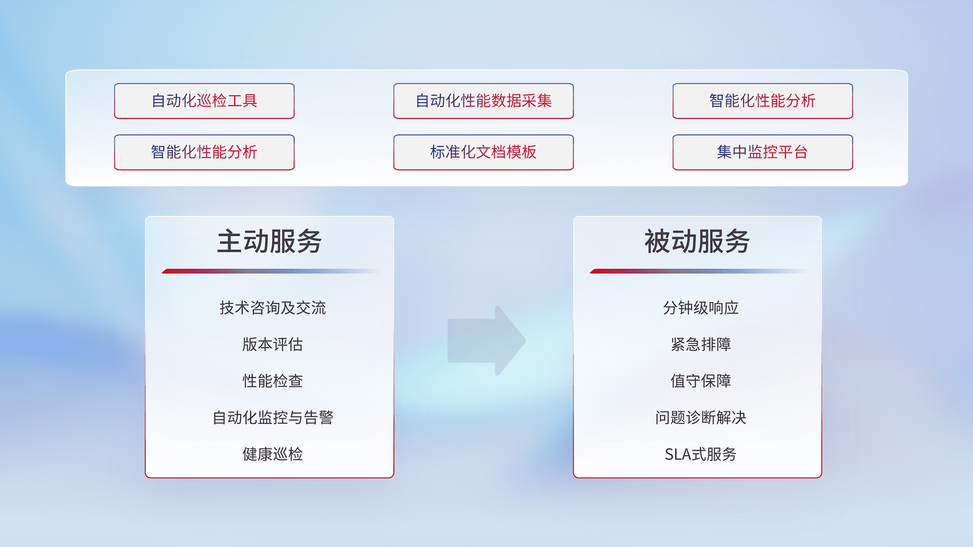 智能化工具和标准化文档,,,,保障服务质量,,提供主动服务(包含技术咨询、、版本评估、、性能检查、、自动化监控与告警、、健康巡检)和被动服务包含(分钟级响应、、、紧急排障、、值守保障、、、问题诊断解决、、SLA服务)。。。