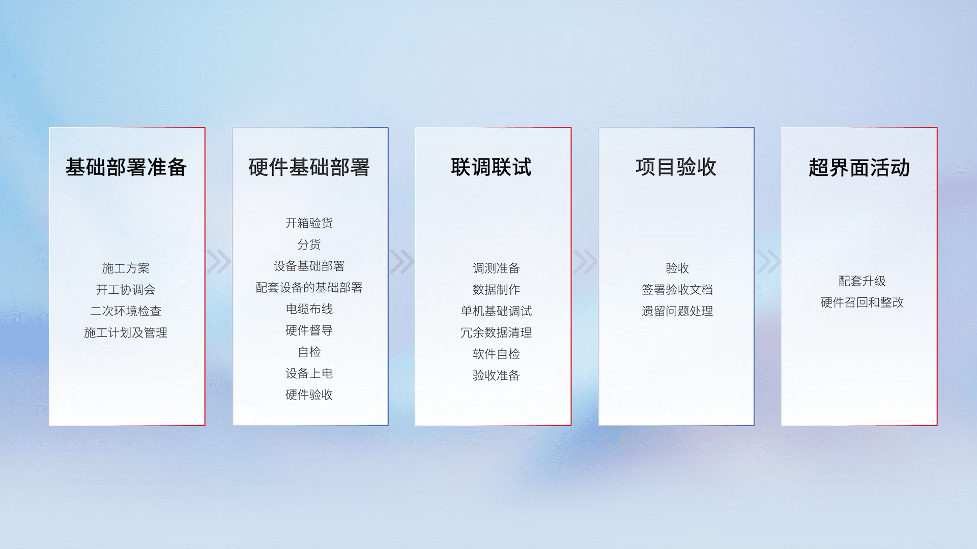 从基础部署准备、、、硬件基础部署、、、联调联试、、、、项目验收、、越界面活动的全过程可追溯,,,,保证施工质量和进度。。。。